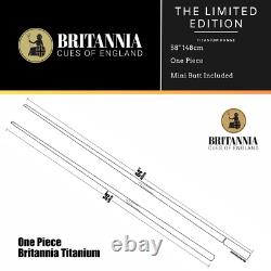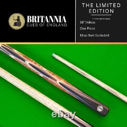 Le Cue en édition limitée Britannia en une seule pièce présente un magnifique ébène Gabon noir d'Afrique, soigneusement assemblé à la main sur le meilleur bois d'érable nord-américain à grain droit, soigneusement sélectionné et assaisonné à l'air. Une attention particulière est portée au motif du grain dans cet érable, garantissant que chaque tige comporte entre 3 et 10 flèches bien formées, uniformément espacées et alignées sur le devant du cue, sur la même face que la partie plate de la poignée. Chaque modèle est ensuite orné de motifs de jointure distincts pour répondre à vos préférences personnelles et fini avec le célèbre insigne en nacre noire émaillée Britannia, gravé et numéroté individuellement.